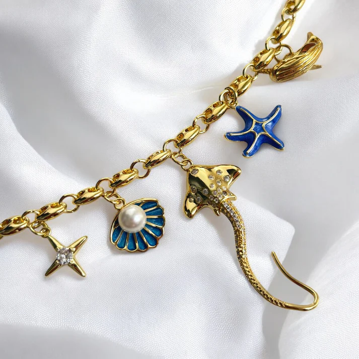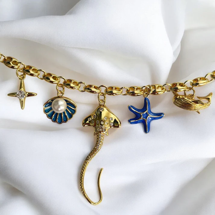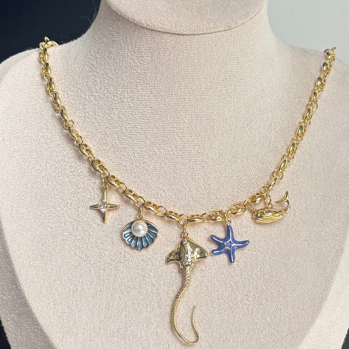 A stunning handmade charm necklace inspired by the deep sea — featuring a radiant star, pearly seashell, sparkling stingray, vibrant starfish, and majestic whale. A treasure from the ocean, full of mystery and elegance. 🌊✨🐋