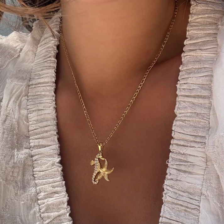 The Naya necklace celebrates ocean magic with a golden seahorse and starfish duo, accented by shimmering crystals — a playful yet graceful reminder of freedom, wonder, and deep connection to the sea.